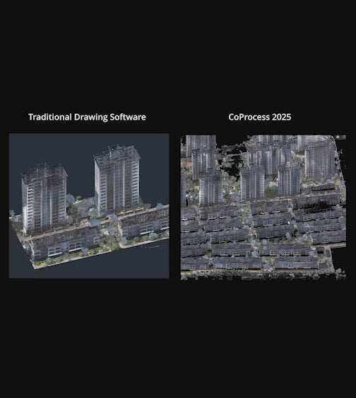 CoProcess 2025 loads 50 GB point clouds on just 16 GB of RAM, utilising on-the-fly slicing without any point thinning. To resolve occlusions, point clouds can be overlaid with oblique models, whilst the Depth Rendering mode clarifies dark facades-independent of RGB or intensity data-to guarantee accurate and complete building contours.